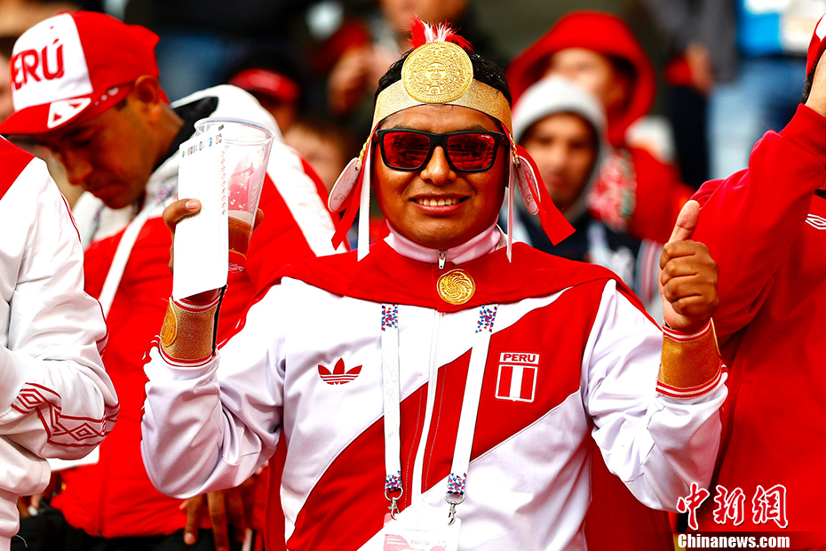当地时间6月21日,世界杯小组赛法国队对阵秘鲁队的比赛即将在叶卡捷琳堡体育场打响。赛前,各式装扮的秘鲁球迷格外引人注目。 中新社记者 富田 摄