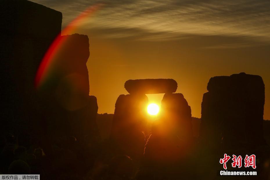 当地时间6月21日,英国英格兰威尔特郡,人们聚集在巨石阵附近观看日出,迎接夏至日到来。
