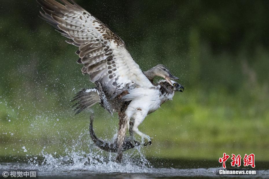 2018年6月21日讯(具体拍摄时间不详),英国苏格兰高地,一只愤怒的绿头鸭袭击一只捕食的鱼鹰。摄影师Andy Howard对于当时眼前的景象感到十分震惊,并用镜头记录下来了整个打斗过程。母鸭最后跳到鱼鹰背上,害得鱼鹰不得不丢下到手的鳟鱼落荒而逃。他表示,没有发现任何明显的原因会引发这场打斗,母鸭并没有幼崽需要保护,而鱼鹰也不吃鸭子。“为了赶在晨光出现时拍照片,我必须凌晨2点钟就起床,但我当时并不知道有这么精彩的一出戏在等着我。” 图片来源:视觉中国