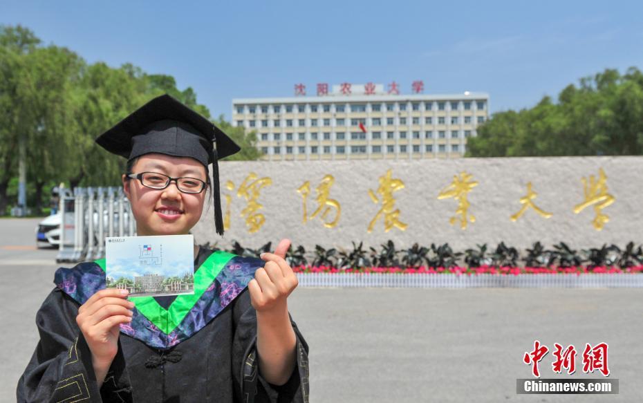 6月21日,毕业生拿着手绘校园景色明信片合影。《遇见沈农》手绘校园景色明信片,在沈阳农业大学毕业季精彩呈现。选取十处校园美景手绘制作,分别为校门、图书馆、1952楼、禾丰体育馆等地。 中新社记者 于海洋 摄