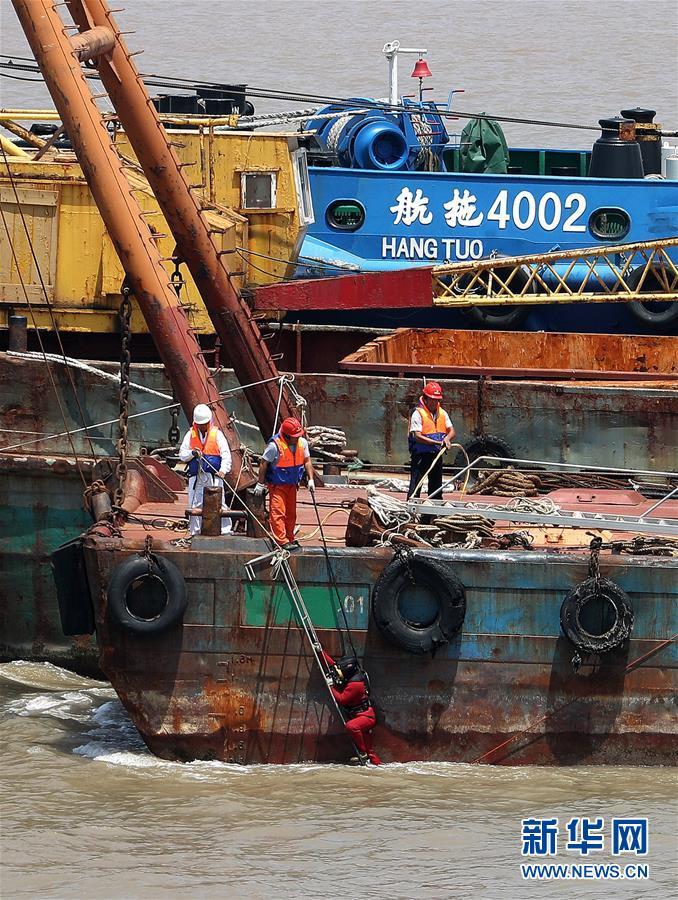 6月21日,在杭州湾北岸水域船舶灾害应急处置演习现场,潜水员对船舶进行水下检查。  当日,杭州湾北岸水域船舶灾害应急处置演习在上海市金山区漕泾危险品船舶锚地举行。新华社记者 陈飞 摄
