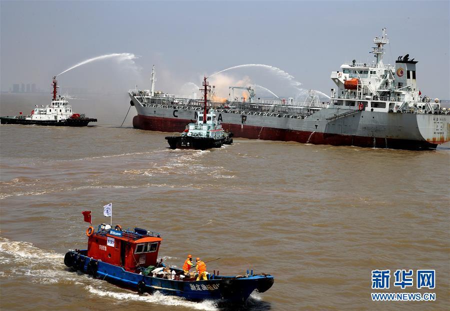 杭州湾北岸水域船舶灾害应急处置演习现场(6月21日摄)。  6月21日,杭州湾北岸水域船舶灾害应急处置演习在上海市金山区漕泾危险品船舶锚地举行。新华社记者 陈飞 摄