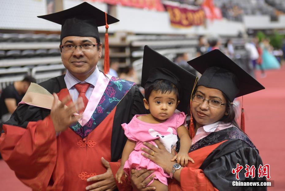 6月23日,外国博士留学生夫妇同时毕业,一家人拍合影纪念。当日,山东大学2018年毕业典礼暨学位授予仪式在济南举行,多对博士夫妇携带子女同场庆祝毕业。 中新社记者 张勇 摄
