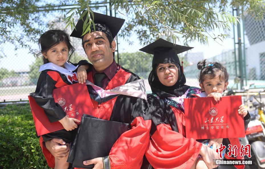6月23日,外国博士留学生夫妇同时毕业,一家人拍合影纪念。当日,山东大学2018年毕业典礼暨学位授予仪式在济南举行,多对博士夫妇携带子女同场庆祝毕业。 中新社记者 张勇 摄