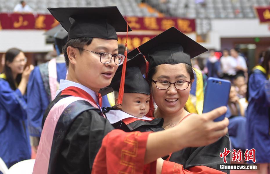 6月23日,博士夫妇同时毕业,一家人拍合影纪念。当日,山东大学2018年毕业典礼暨学位授予仪式在济南举行,多对博士夫妇携带子女同场庆祝毕业。 中新社记者 张勇 摄