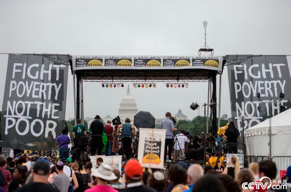 央视网消息:当地时间2018年6月23日,美国华盛顿,民众在国家广场参加“穷人集会”,抗议社会不公正及贫穷。