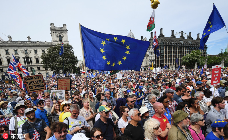 当地时间2018年6月23日,英国伦敦,时值英国脱欧公投两周年之际,23日上万英国民众在伦敦市中心示威游行,呼吁对英国脱欧协议进行最终公投。这是自2016年脱欧公投以来最大规模的一次示威游行。示威游行队伍由支持欧盟、反对脱欧的抗议者组成,他们手举欧盟旗帜和“脱欧协议必须全民公投”的横幅,经过首相府所在地的唐宁街时,发出响亮的嘘声,最后聚集在伦敦市中心的议会广场。