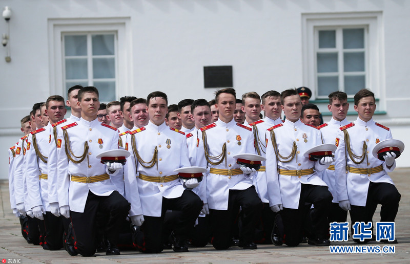 当地时间2018年6月23日,俄罗斯莫斯科,莫斯科苏沃罗夫军校、莫斯科苏沃罗夫军事音乐学院以及俄国防部女子青少年团寄宿学校在克里姆林宫的大教堂广场,举行联合毕业典礼。(图片来源:东方IC)