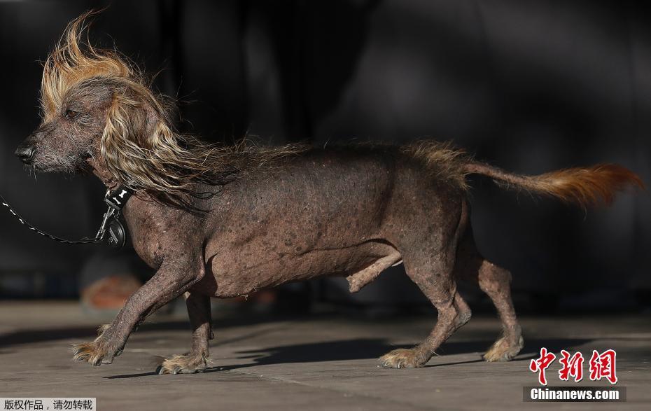 当地时间2018年6月23日,美国加州佩塔卢马,一只冠毛腊肠犬参加世界最丑狗狗大赛。​