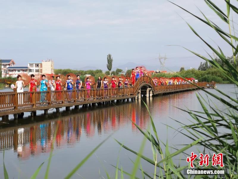 甘肃戈壁湿地公园上演旗袍秀展示传统美