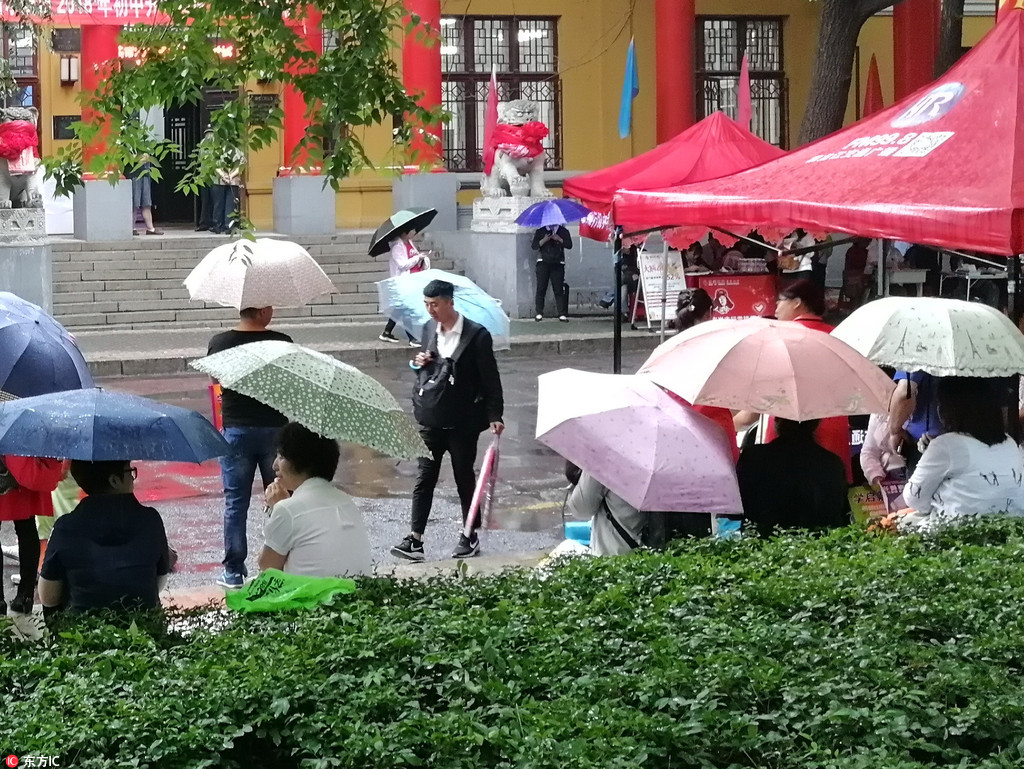 6月25日,哈尔滨市举行初中升高中考试,当天下起了阵雨。在各考场外,前来陪考的家长们打着伞站在雨中,等待着自己的孩子。衣裤被雨水淋湿,但他们却坚守不动,真是“可怜天下父母心”。(来源:东方IC)