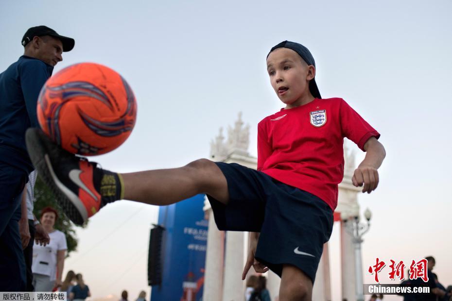 当地时间6月20日,一名身着英格兰队服的俄罗斯小朋友在伏尔加格勒的球迷广场上,展示自己的精湛球技。可能再过十年,他就是俄罗斯的下一个戈洛温呢?