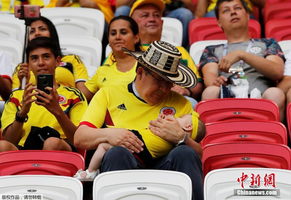 当地时间6月24日,波兰与哥伦比亚的比赛开始前,一名哥伦比亚的球迷怀中的孩子正在睡觉。再过一会儿比赛开始,孩子就要从睡梦中醒来,进入世界杯模式了。