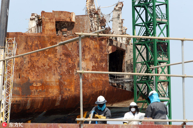 当地时间2018年6月25日,韩国木浦新港,韩国“世越”号船体调查委员会工作人员进入船舱内部,重启失踪者搜寻工作。​