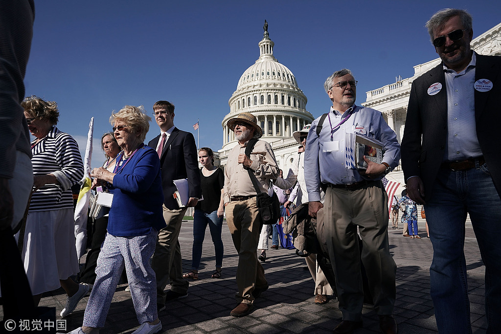 当地时间2018年6月25日,美国华盛顿,在国会山举行的前往参议院哈特办公大楼的游行。示威者敦促国会支持修复美国宪法修正案,以控制政治上的巨额财富,遏制重新划分选区过程中的不公平事件。Alex Wong/视觉中国