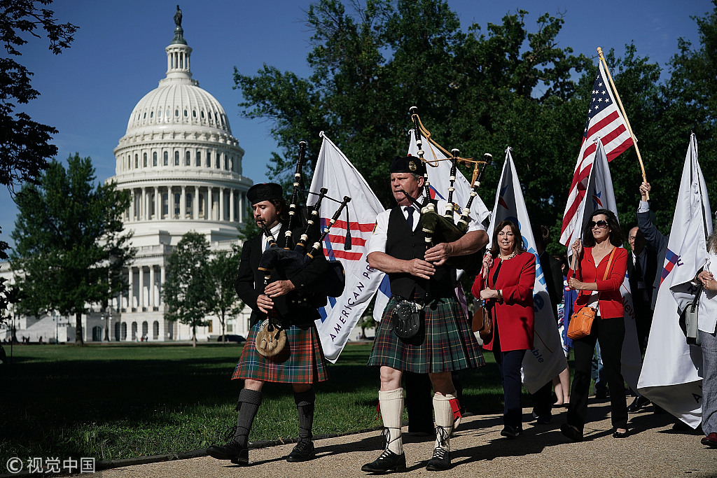 当地时间2018年6月25日,美国华盛顿,在国会山举行的前往参议院哈特办公大楼的游行。示威者敦促国会支持修复美国宪法修正案,以控制政治上的巨额财富,遏制重新划分选区过程中的不公平事件。Alex Wong/视觉中国