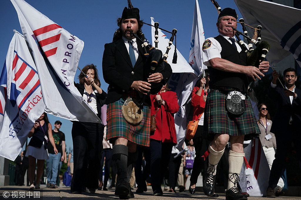 当地时间2018年6月25日,美国华盛顿,在国会山举行的前往参议院哈特办公大楼的游行。示威者敦促国会支持修复美国宪法修正案,以控制政治上的巨额财富,遏制重新划分选区过程中的不公平事件。Alex Wong/视觉中国