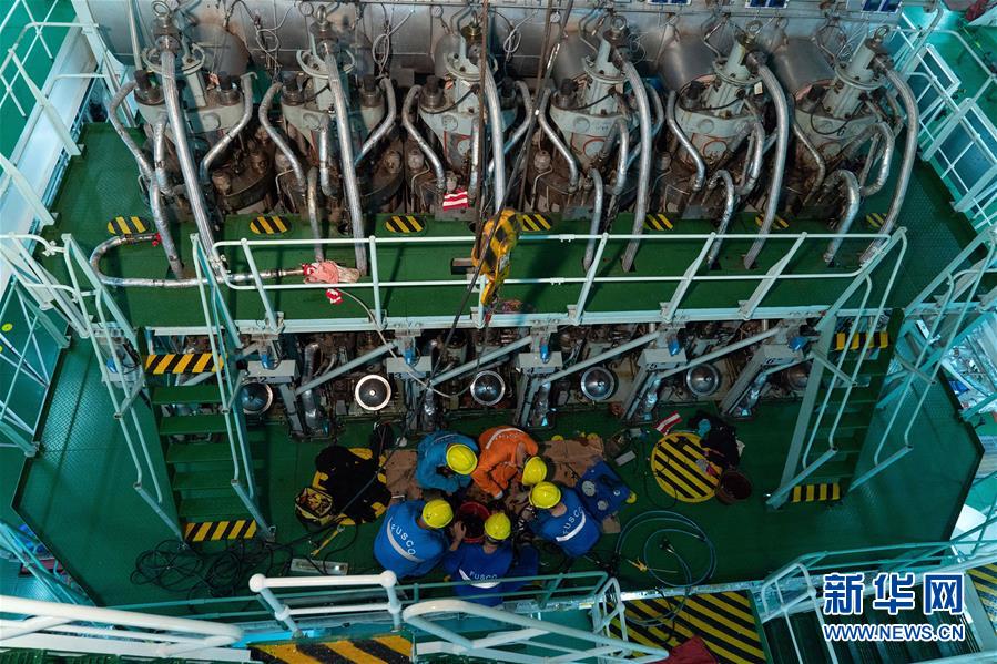 6月17日,在天津港南疆港区,“金海发”轮轮机部工作人员在对主发动机进行维修保养。新华社记者 才扬 摄