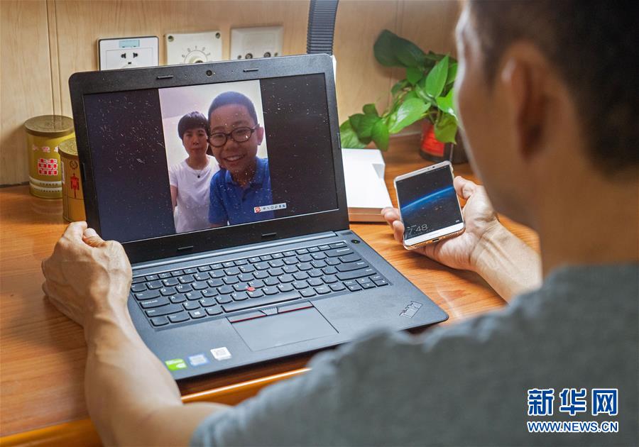 6月18日,在天津港南疆港区,“金海发”轮船长吕良鹏与家人视频。在航行期间,大部分时间是没有手机信号的。新华社记者 才扬 摄