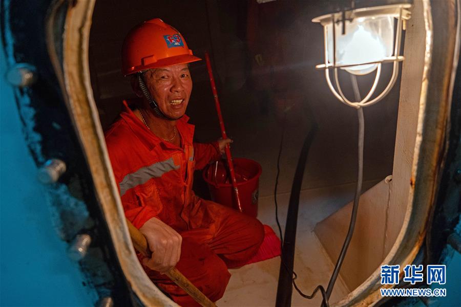 6月22日,“金海发”轮水手长刘祖宝在航行中清洗淡水舱。新华社记者 才扬 摄