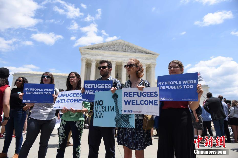 当地时间6月26日,在美国联邦最高法院裁决支持特朗普2017年颁布的移民限制令后,民众在最高法院门口抗议。中新社记者 邓敏 摄