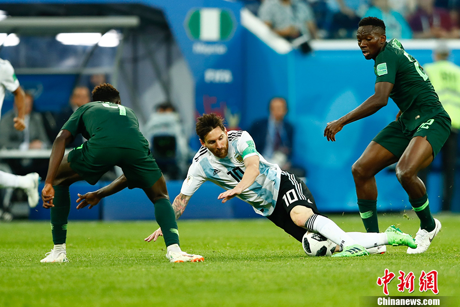 北京时间6月27日凌晨,2018俄罗斯世界杯D组阿根廷与尼日利亚的“生死战”在圣彼得堡新泽尼特体育场打响。梅西、罗霍建功,阿根廷队2-1战胜尼日利亚。在D组同时进行的另一场比赛中,克罗地亚2-1战胜冰岛,克罗地亚、阿根廷分列D组第一第二晋级16强。阿根廷将与C组第一法国队争夺一个8强席位。 中新社记者 富田 摄