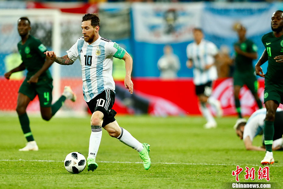 北京时间6月27日凌晨,2018俄罗斯世界杯D组阿根廷与尼日利亚的“生死战”在圣彼得堡新泽尼特体育场打响。梅西、罗霍建功,阿根廷队2-1战胜尼日利亚。在D组同时进行的另一场比赛中,克罗地亚2-1战胜冰岛,克罗地亚、阿根廷分列D组第一第二晋级16强。阿根廷将与C组第一法国队争夺一个8强席位。 中新社记者 富田 摄
