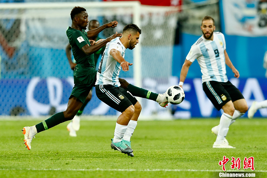 北京时间6月27日凌晨,2018俄罗斯世界杯D组阿根廷与尼日利亚的“生死战”在圣彼得堡新泽尼特体育场打响。梅西、罗霍建功,阿根廷队2-1战胜尼日利亚。在D组同时进行的另一场比赛中,克罗地亚2-1战胜冰岛,克罗地亚、阿根廷分列D组第一第二晋级16强。阿根廷将与C组第一法国队争夺一个8强席位。 中新社记者 富田 摄
