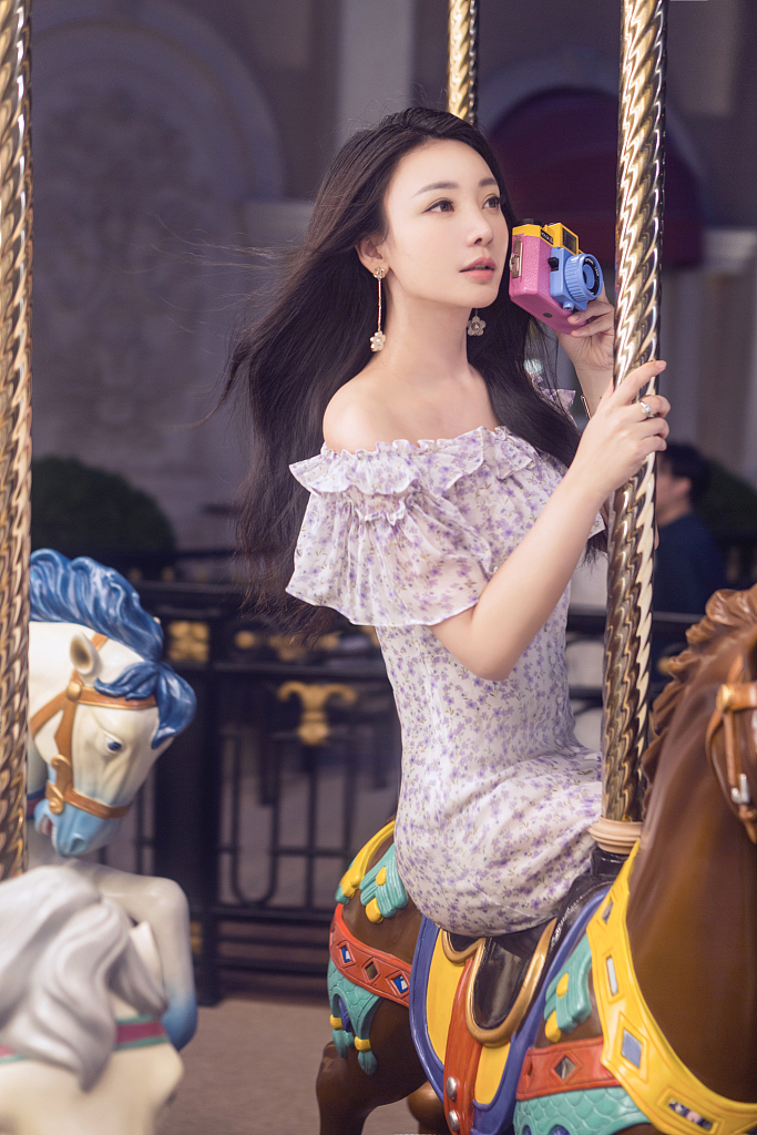 柳岩以都市伊人形象现身澳门街头拍摄宣传片,只见她坐在旋转木马上浪漫似少女。