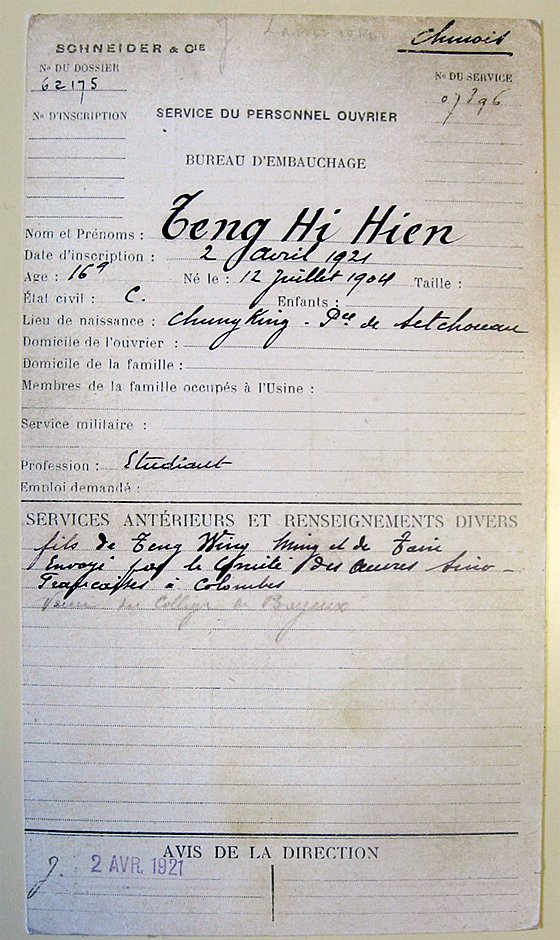 邓小平在施耐德工厂的雇佣登记卡。上面是邓小平学名“邓希贤”的音译。工卡现存施耐德工厂资料室