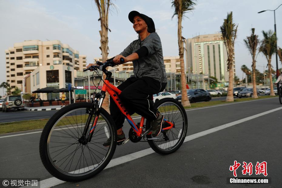 当地时间2018年6月24日,沙特阿拉伯吉达,沙特时装设计师Eman Joharjy在骑自行车。 图片来源:视觉中国