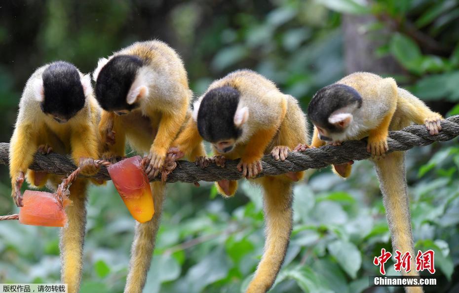 四只黑头松鼠猴正在“探讨”如何分享仅有两块的水果冰。