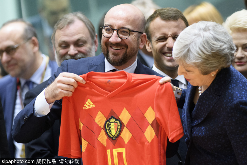 当地时间2018年6月28日,比利时布鲁塞尔,欧洲峰会当日举行,比利时首相查尔斯·米歇尔赠送球衣。据悉,比利时在俄罗斯世界杯表现上佳,比利时1-0英格兰,两队携手晋级16强。
