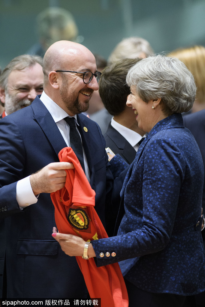 当地时间2018年6月28日,比利时布鲁塞尔,欧洲峰会当日举行,比利时首相查尔斯·米歇尔赠送球衣。据悉,比利时在俄罗斯世界杯表现上佳,比利时1-0英格兰,两队携手晋级16强。