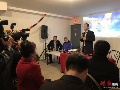 中国驻纽约副总领事邱舰在讲座中介绍冒充领馆的电话骗局。(图片来源:美国《侨报》)