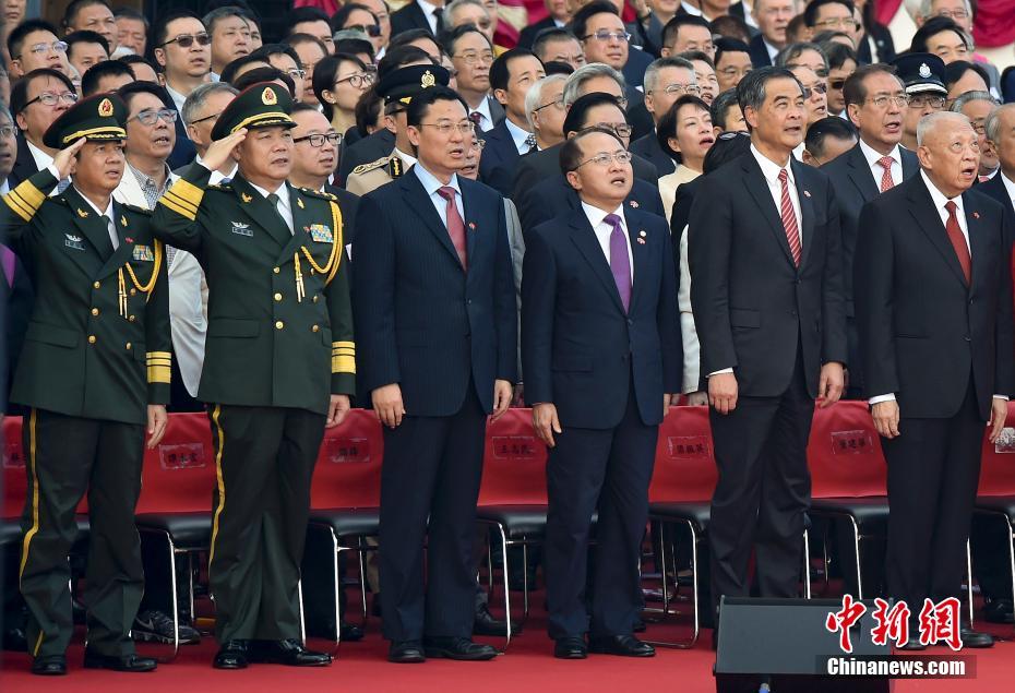 7月1日,香港特别行政区政府在金紫荆广场举行隆重的升旗仪式,庆祝香港回归21周年。图为全国政协副主席董建华(前排右一)、全国政协副主席梁振英(前排右二)、中央政府驻港联络办主任王志民(前排右三)、外交部驻香港特别行政区特派员公署特派员谢锋(前排左三)、解放军驻港部队司令员谭本宏(前排左二)、解放军驻港部队政委蔡永中(前排左一)等在升旗仪式上高唱国歌。中新社记者 张炜 摄