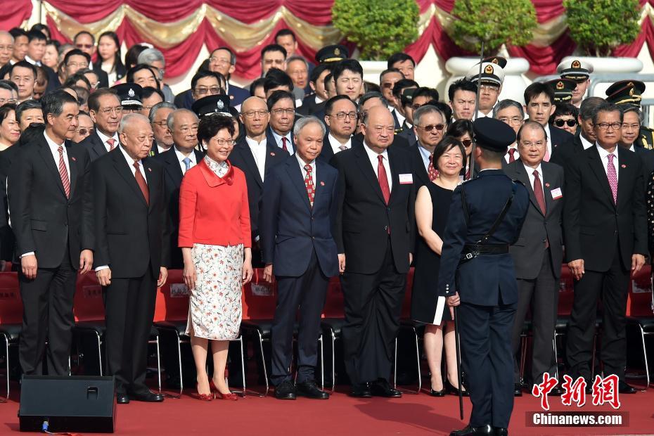 7月1日,香港特别行政区政府在金紫荆广场举行隆重的升旗仪式,庆祝香港回归21周年。图为全国政协副主席董建华(前排左二)、全国政协副主席梁振英(前排左一)和香港特区行政长官林郑月娥(前排左三)等出席升旗仪式。中新社记者 张炜 摄