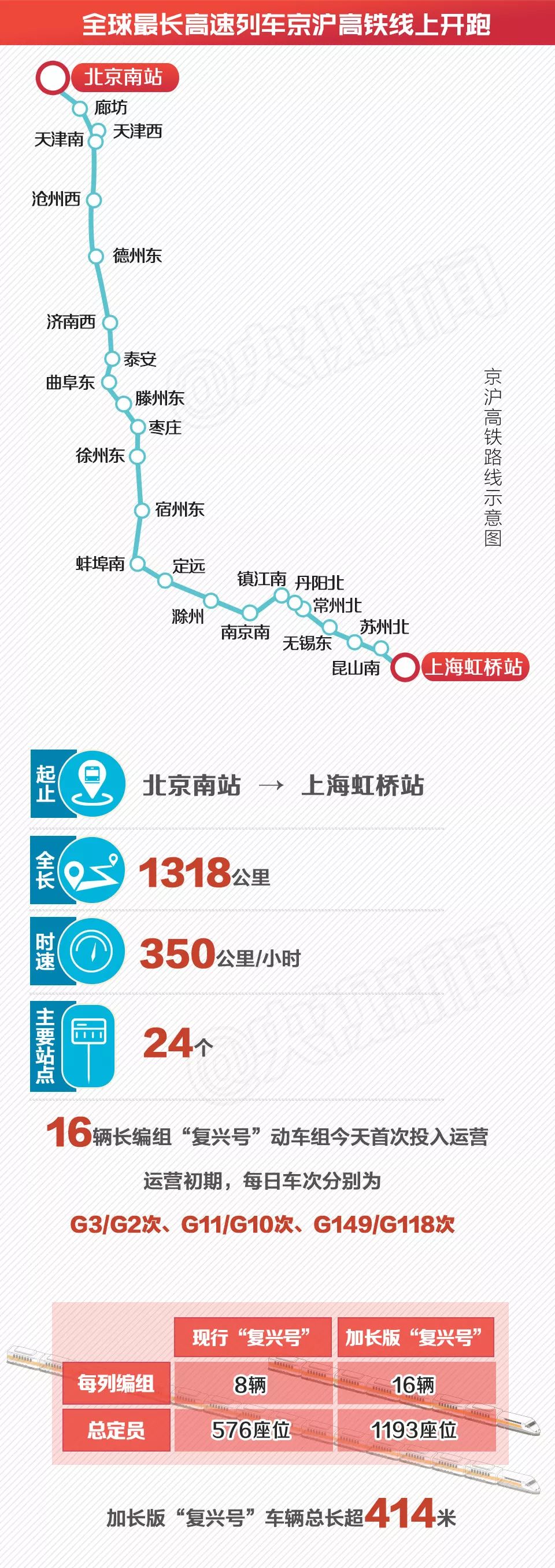今天(7月1日),16辆编组加长版的“复兴号”动车组列车首次在京沪高铁上线运行。计划每天投入运行3列,开行6趟。
