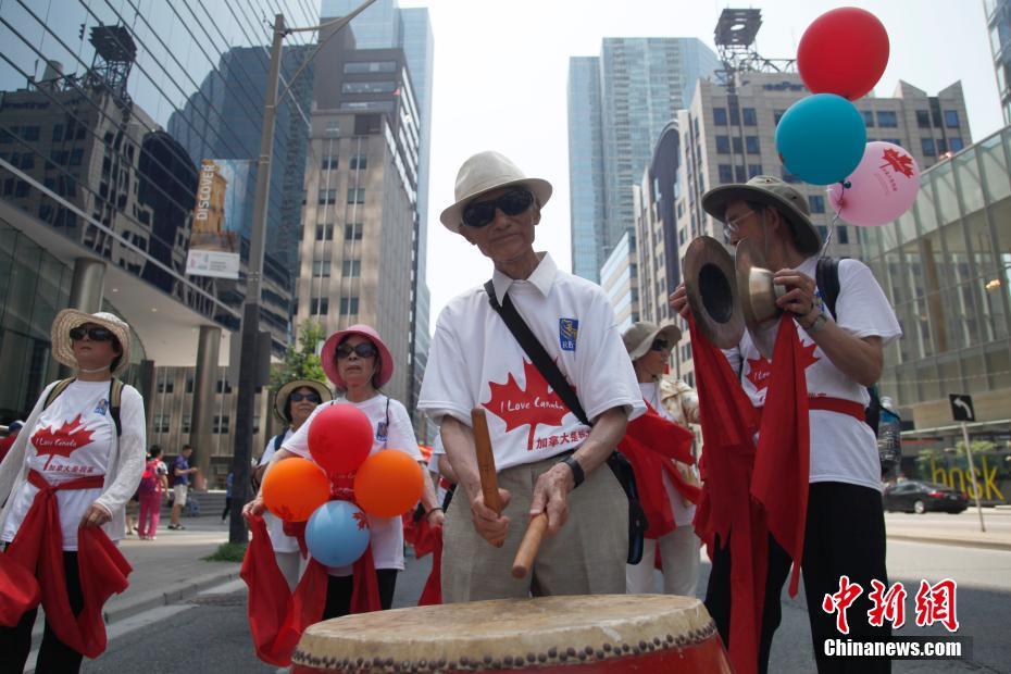 当地时间7月1日,全加华人联会(安大略区)在加拿大第一大城市多伦多市中心举行大游行,庆祝加拿大151周年国庆。图为老侨击鼓引领方阵行进。中新社记者 余瑞冬 摄