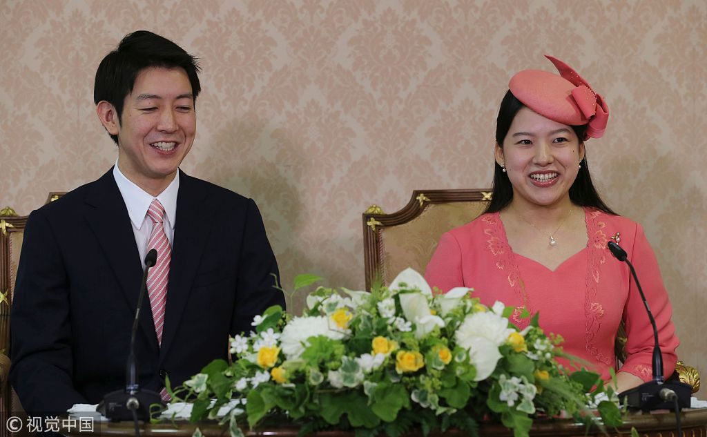 当地时间2018年7月2日,日本东京,日本绚子公主和未婚夫守谷慧出席记者会,宣布订婚。据悉,绚子公主是日本明仁天皇的表侄女,也就是高圆宫宪仁亲王与宪仁亲王妃久子的三女儿,未婚夫守谷慧是船务公司的一名职员。图片作者:POOL/视觉中国