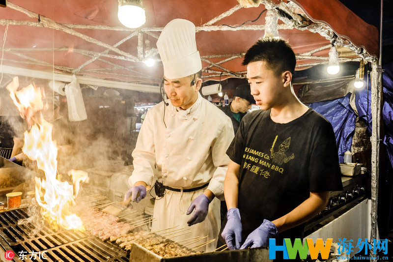 当地时间2018年5月21日,加拿大列治文,加拿大列治文的海鲜久负盛名,大量移民的涌入则促使这里成为当地的亚洲美食天堂。很多人会到这里的夜市品尝中国美食。白天,詹姆斯-陈(穿厨师服的人)在温哥华的高端酒店担任厨师。晚上,他在列治文夜市的摊位烤串烧。ROBERT LEON/东方IC