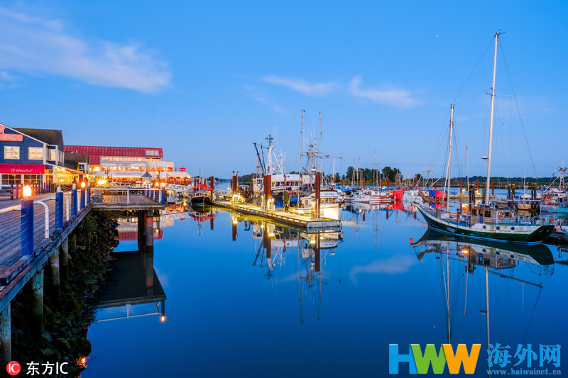 当地时间2018年5月25日,加拿大列治文,加拿大列治文的海鲜久负盛名,大量移民的涌入则促使这里成为当地的亚洲美食天堂。很多人会到这里的夜市品尝中国美食。图为史提夫斯顿的渔人码头。ROBERT LEON/东方IC