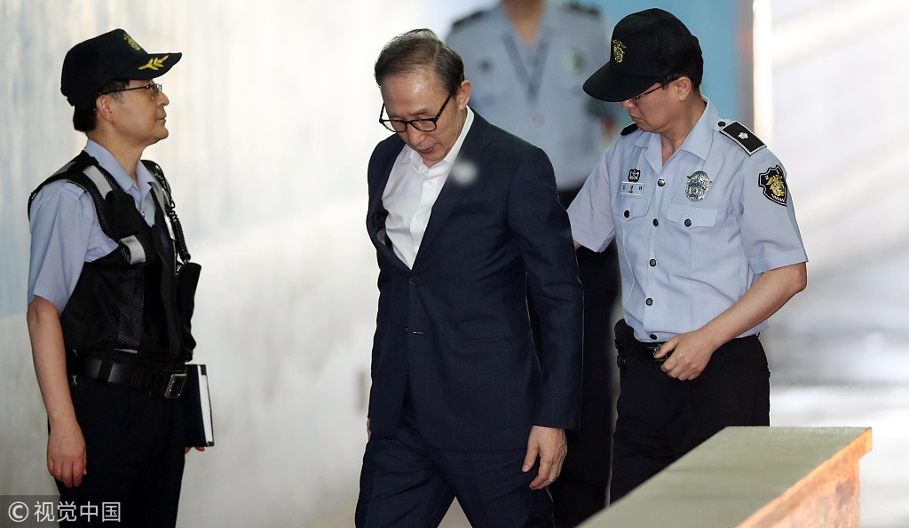 77岁李明博再出庭受审 用手扶墙进法院面容憔悴