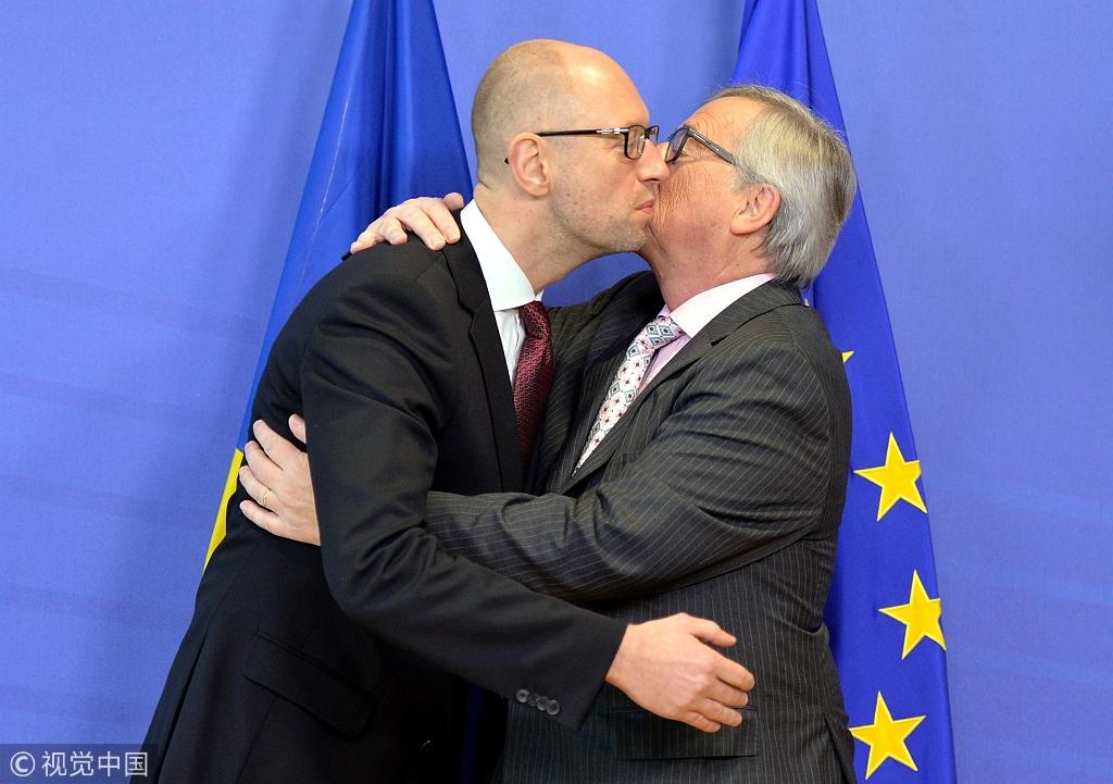 当地时间2015年12月7日,比利时布鲁塞尔,乌克兰总理亚采纽克造访欧盟委员会总部,欧盟委员会主席容克迎接。图片作者:Anadolu Agency/Getty Images