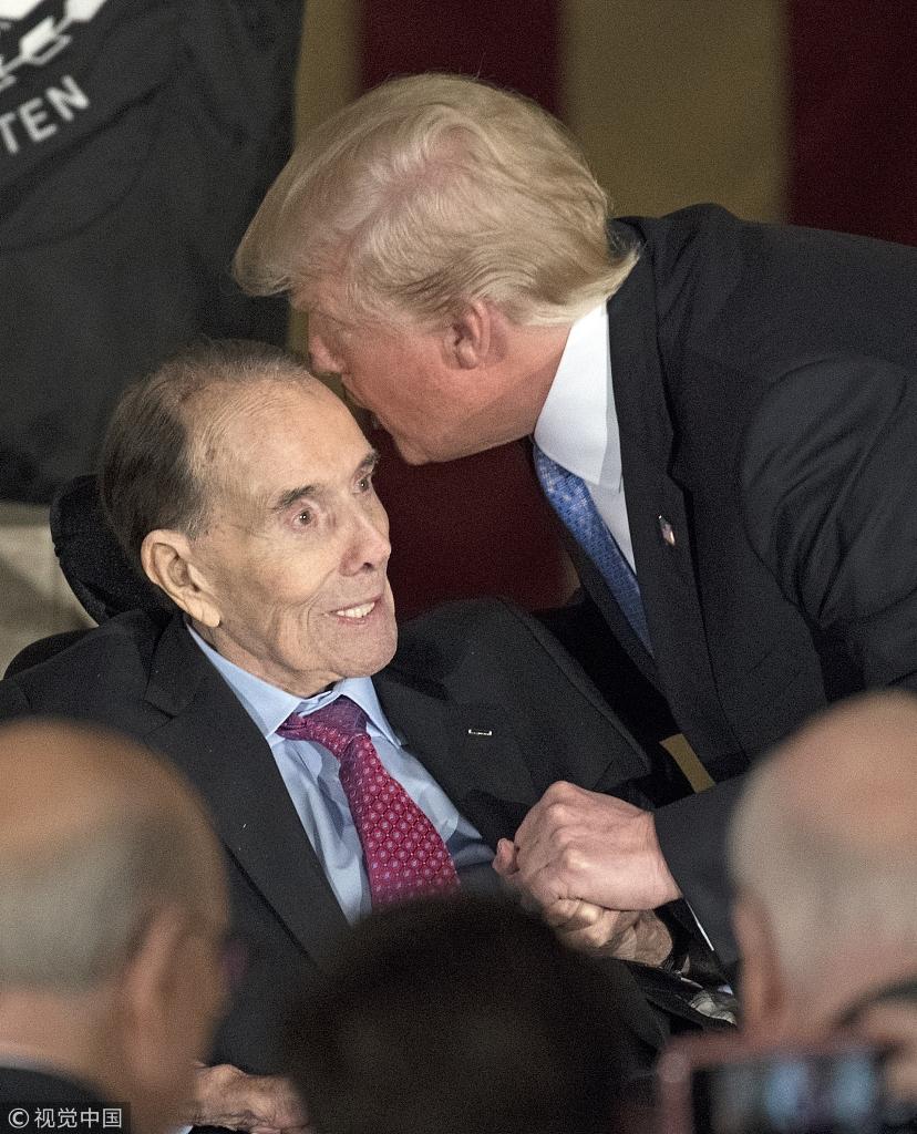 当地时间2018年1月17日,美国华盛顿,美国国会向美国前参议员鲍勃‧杜尔授予国会金质奖章,美国总统特朗普出席仪式。 图片作者:/视觉中国