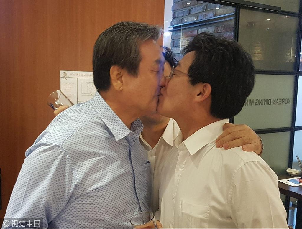 当地时间2017年9月10日,韩国,日前,韩国在野党正党因新领导层构成问题正式陷入矛盾局面。然而,该党议员们10日晚聚餐时却气氛和谐,两名男议员甚至还上演了“辣眼睛”的一幕:亲嘴大戏。图片作者:Yonhap News Agency/视觉中国