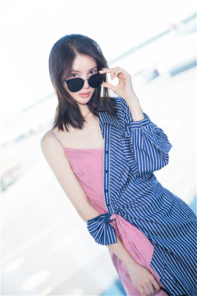 近日,金晨现身机场,身着蓝红双拼条纹衬衫裙搭配黑色平底鞋,果冻包更是展现时髦小心机,黑超掩面,酷劲儿十足。(文/杨静)