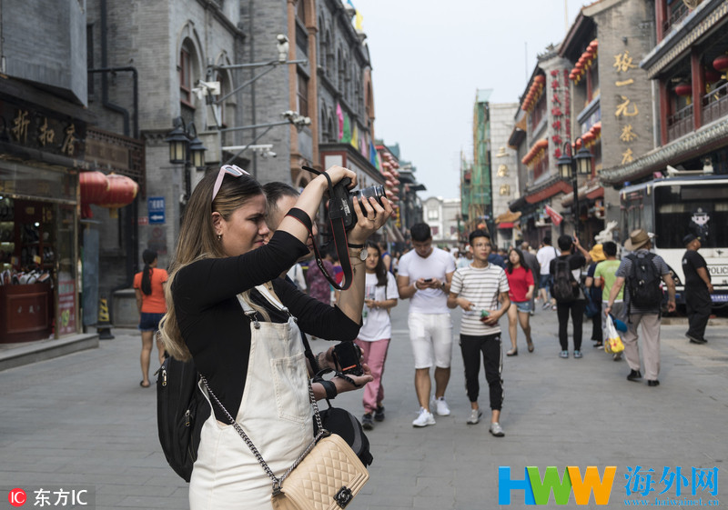 2018年7月1日午后,北京前门大栅栏,中外游客来京必游景点之一。每年都有许多外国游客在这里品尝小吃、参观老字号,欣赏老北京的风韵。图片署名:千龙图像库王秀敏/东方IC