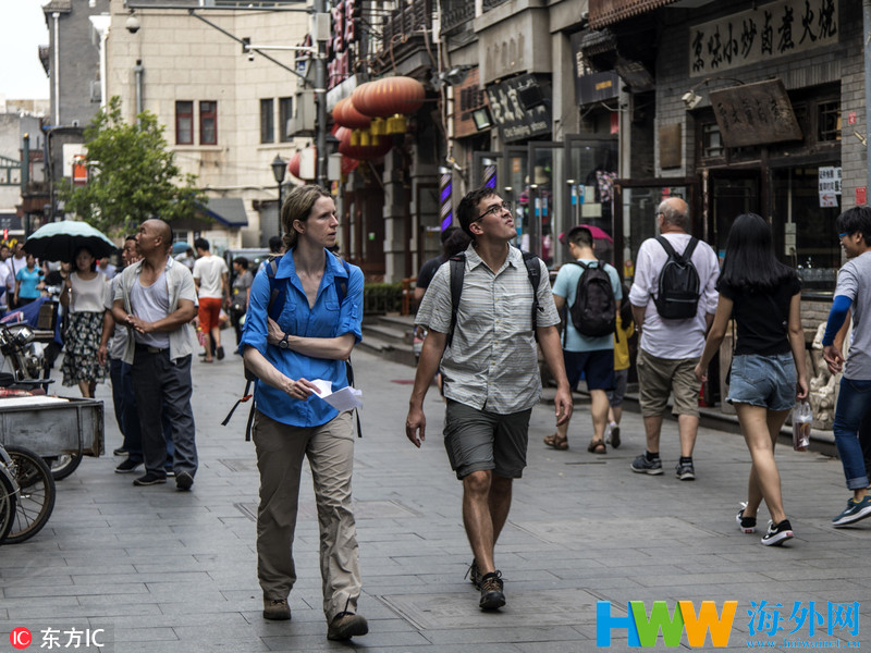 2018年7月1日午后,北京前门大栅栏,中外游客来京必游景点之一。每年都有许多外国游客在这里品尝小吃、参观老字号,欣赏老北京的风韵。图片署名:千龙图像库王秀敏/东方IC