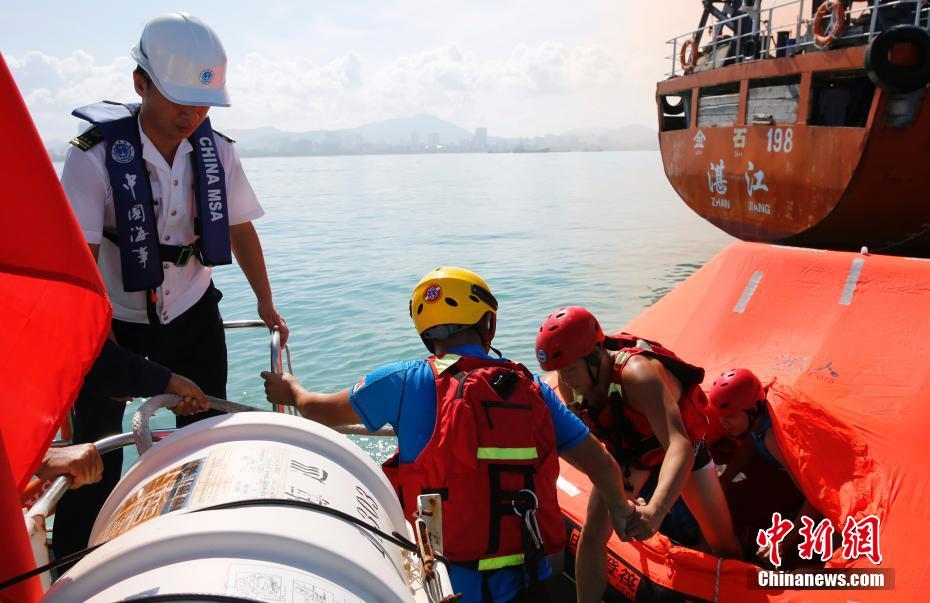 图为演习中,逃生人员获得救助。